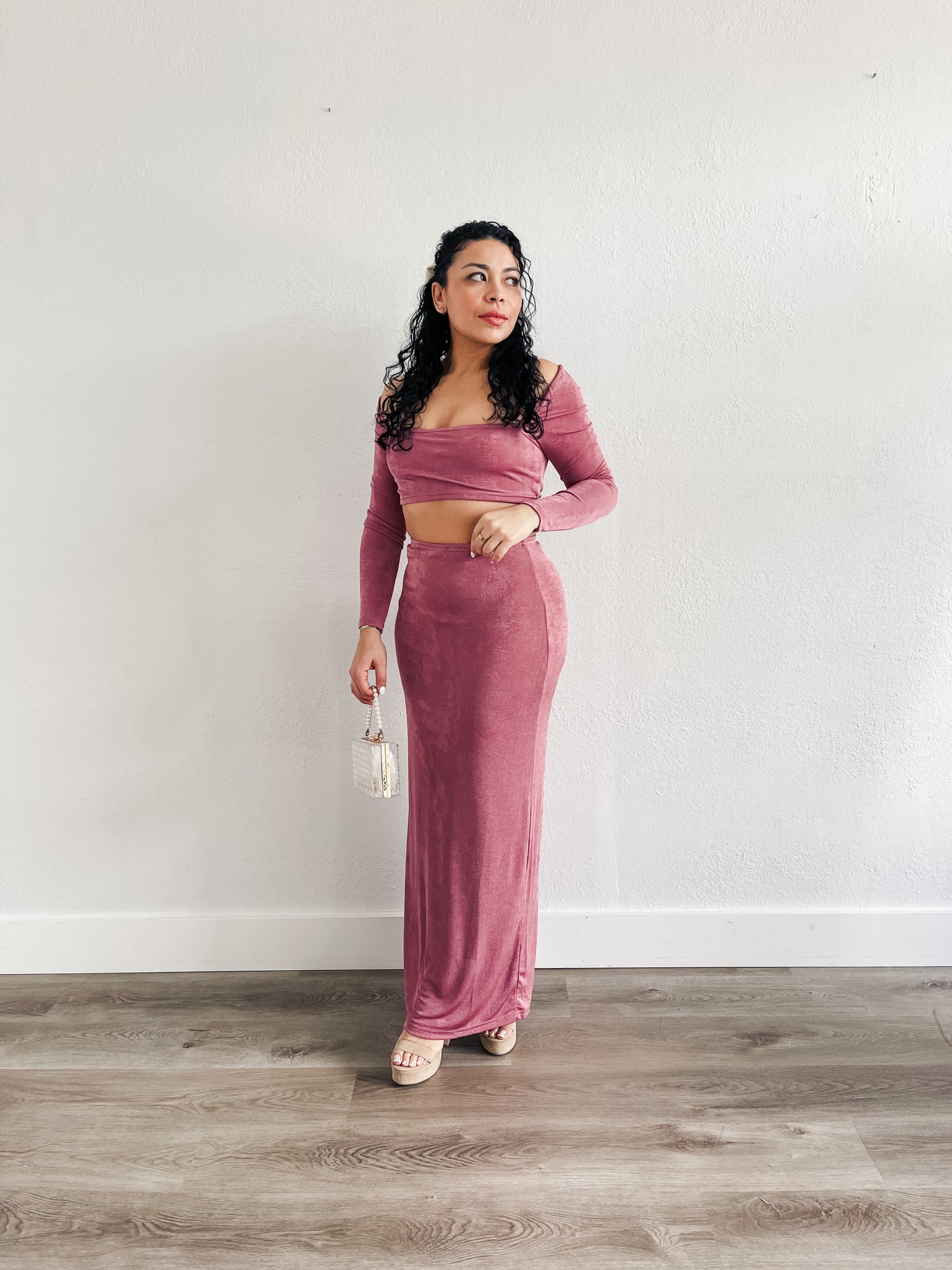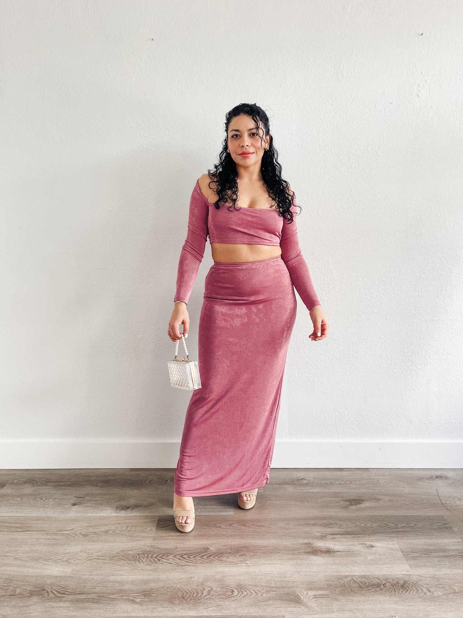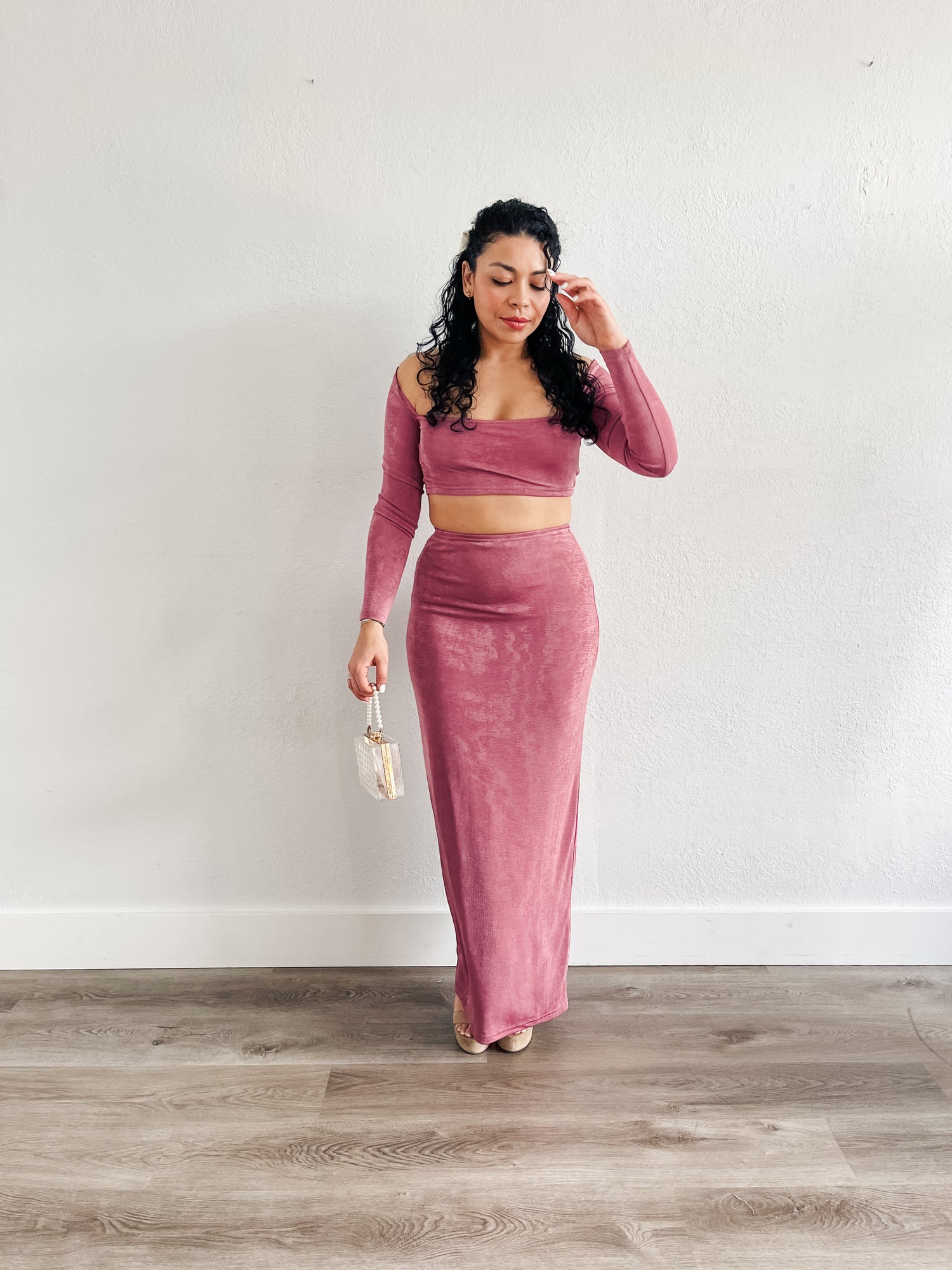 Set features slinky knit fabric, super cropped length, long sleeves, lined bodice and matching skirt with elasticized waist.