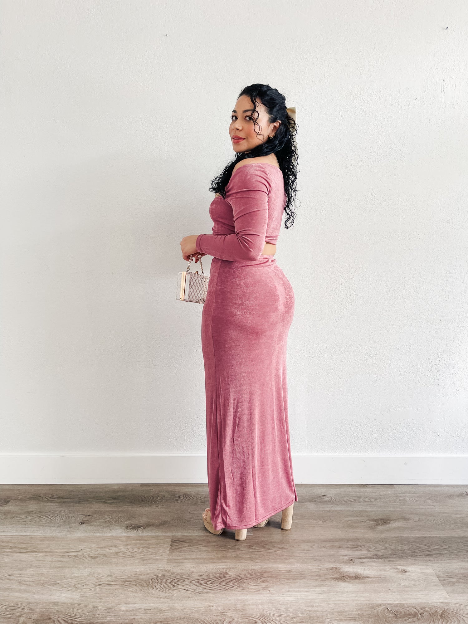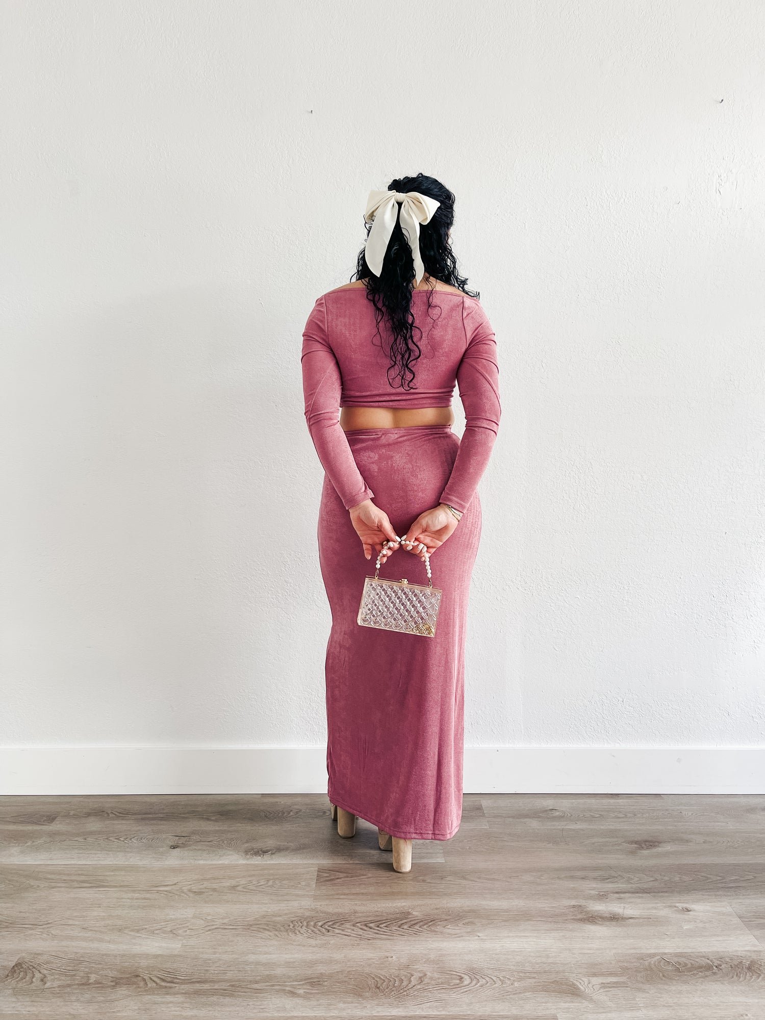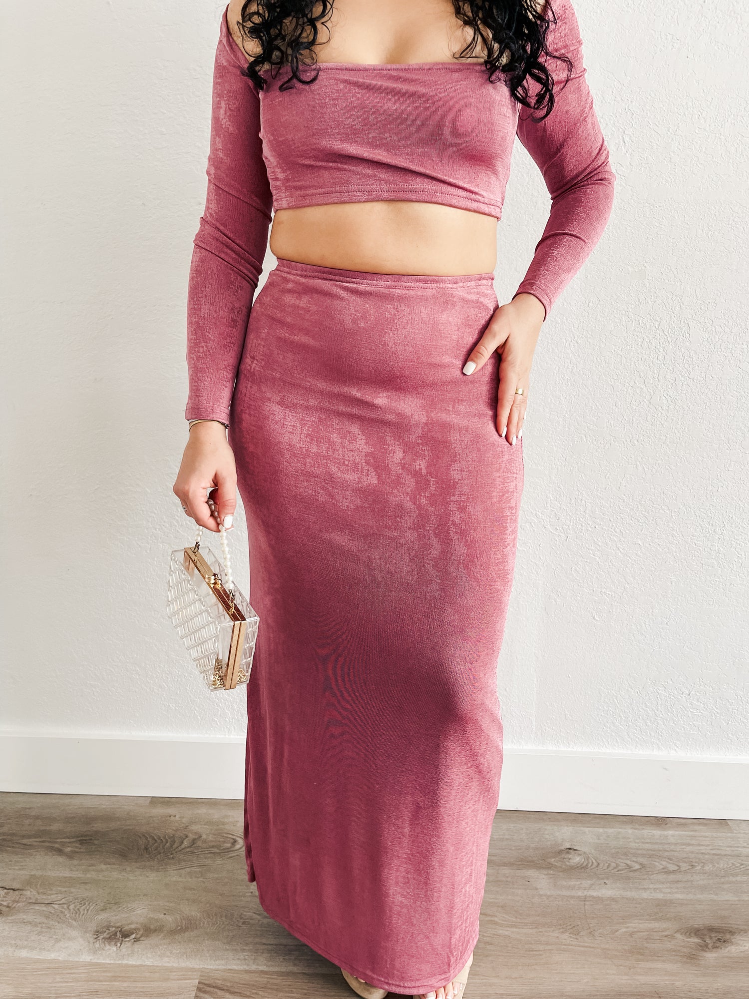 Set features slinky knit fabric, super cropped length, long sleeves, lined bodice and matching skirt with elasticized waist.