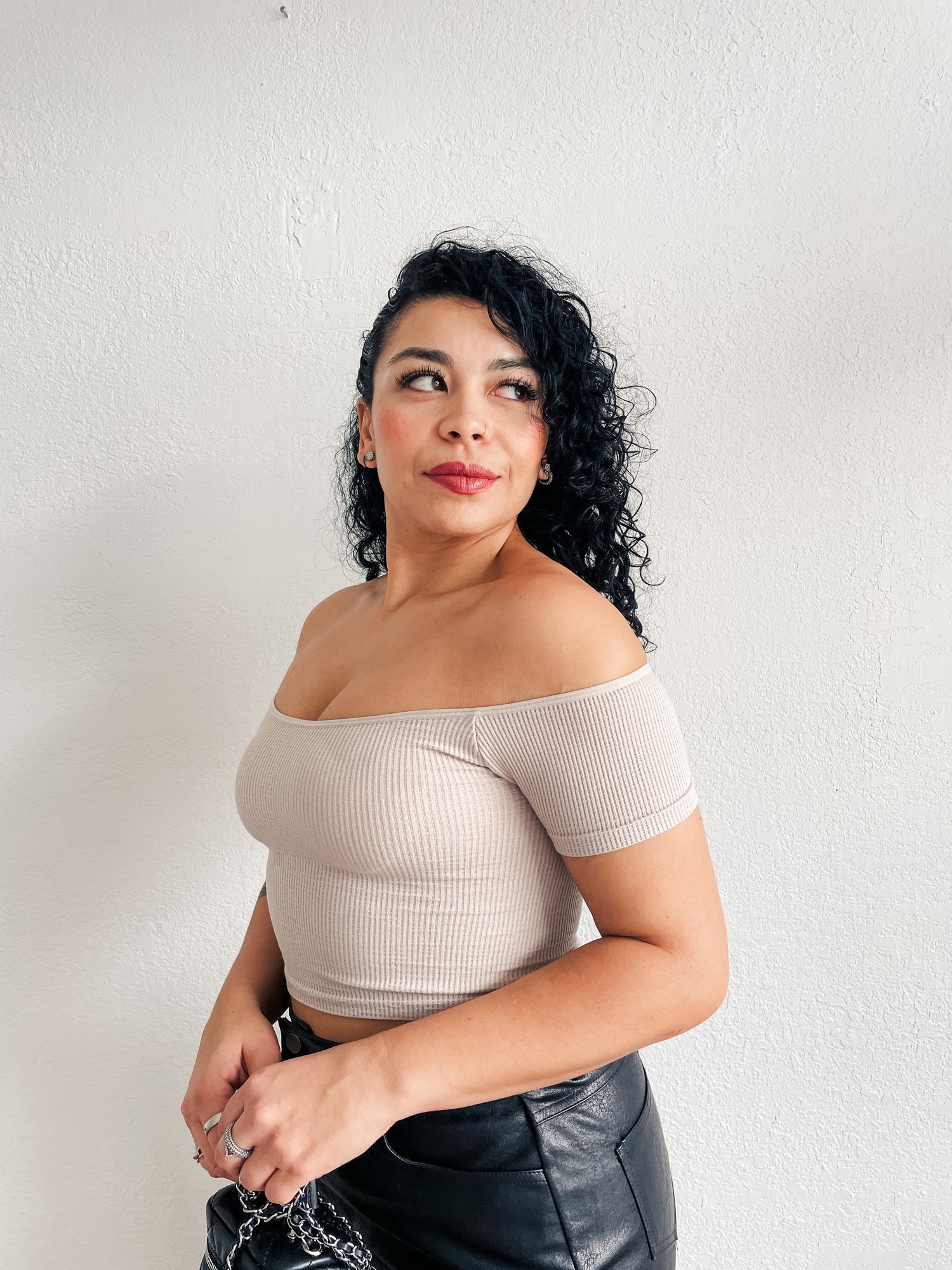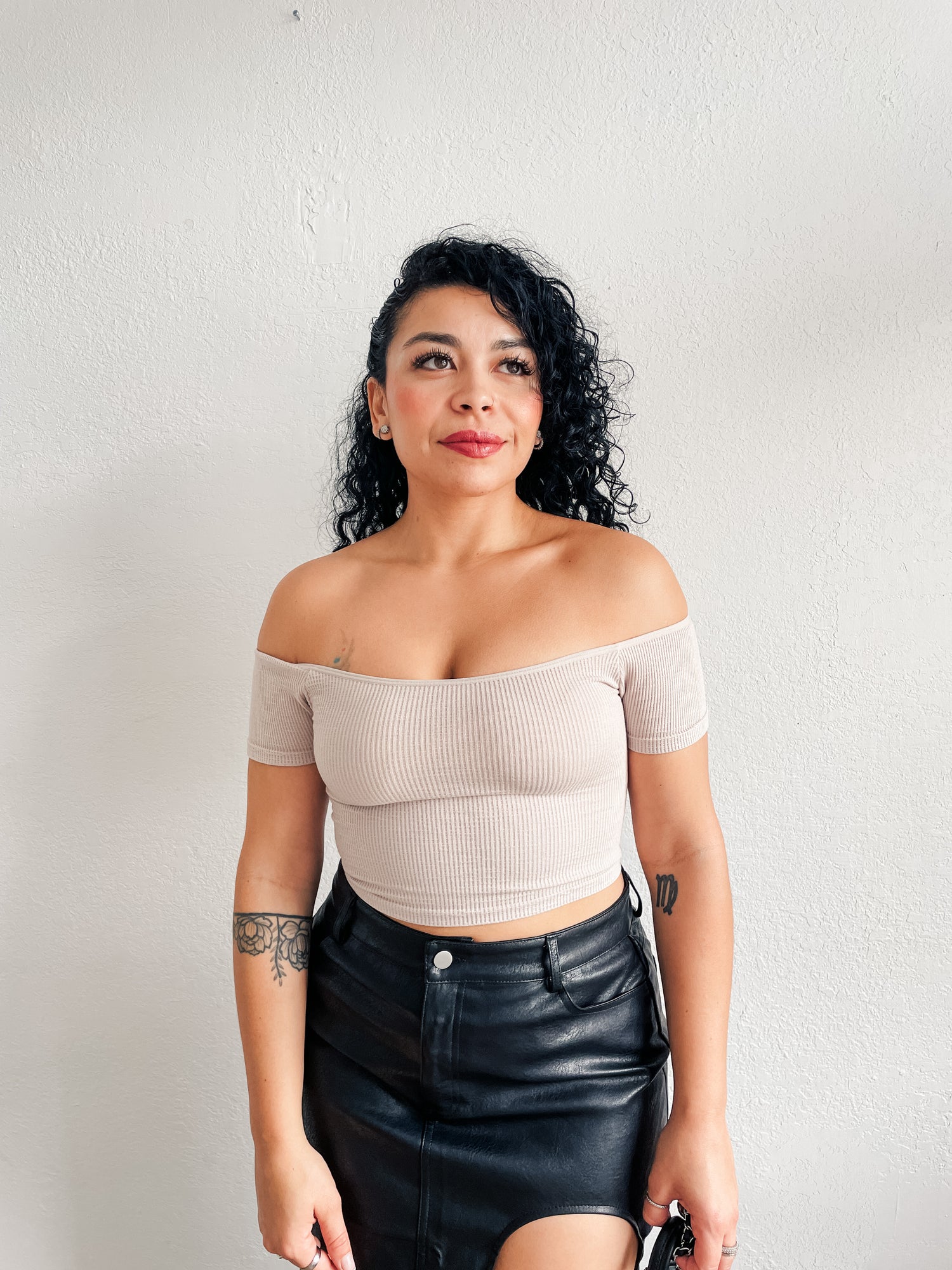 Top features knit material, stretchy, seamless off the shoulder and crop length.