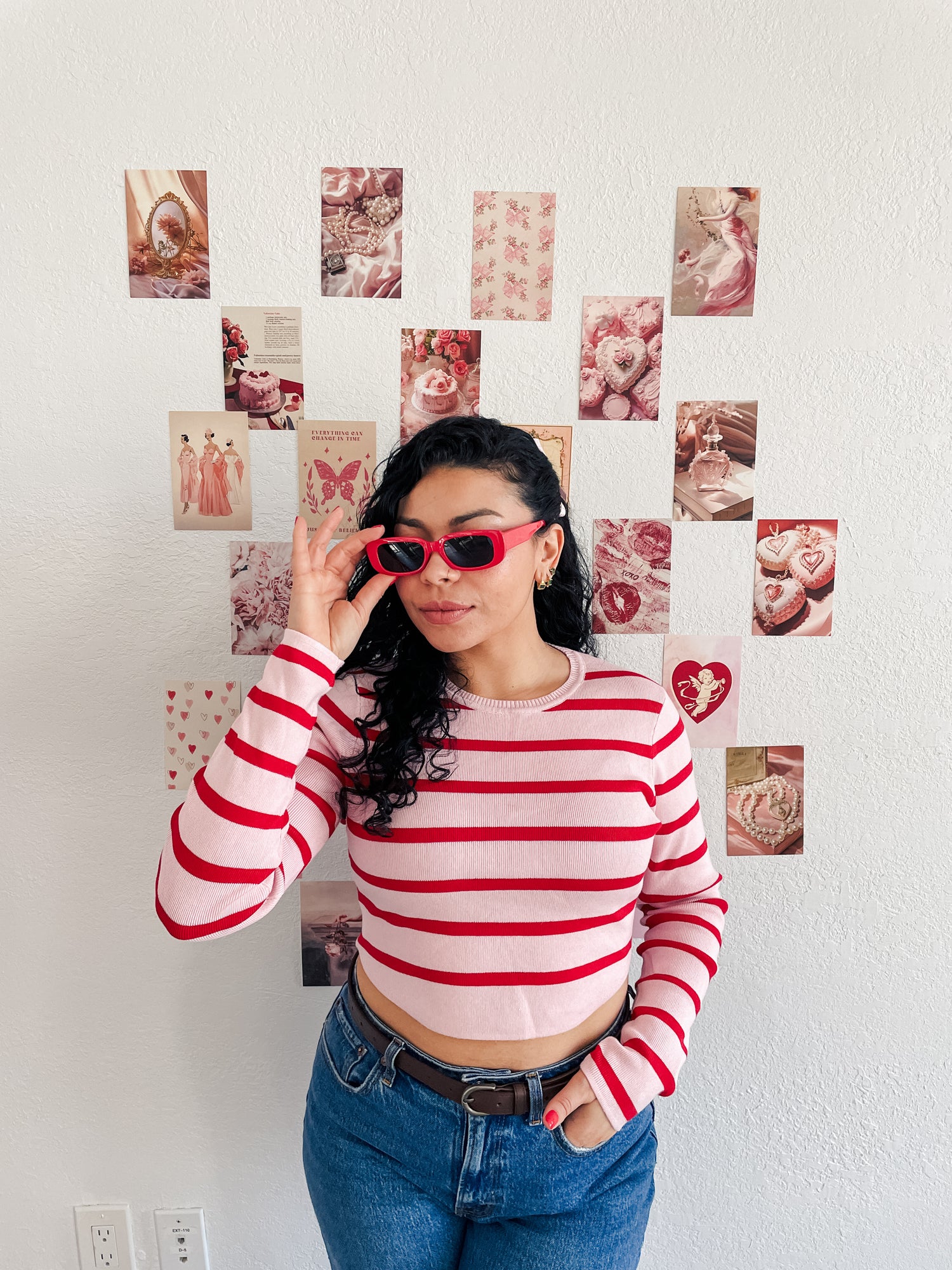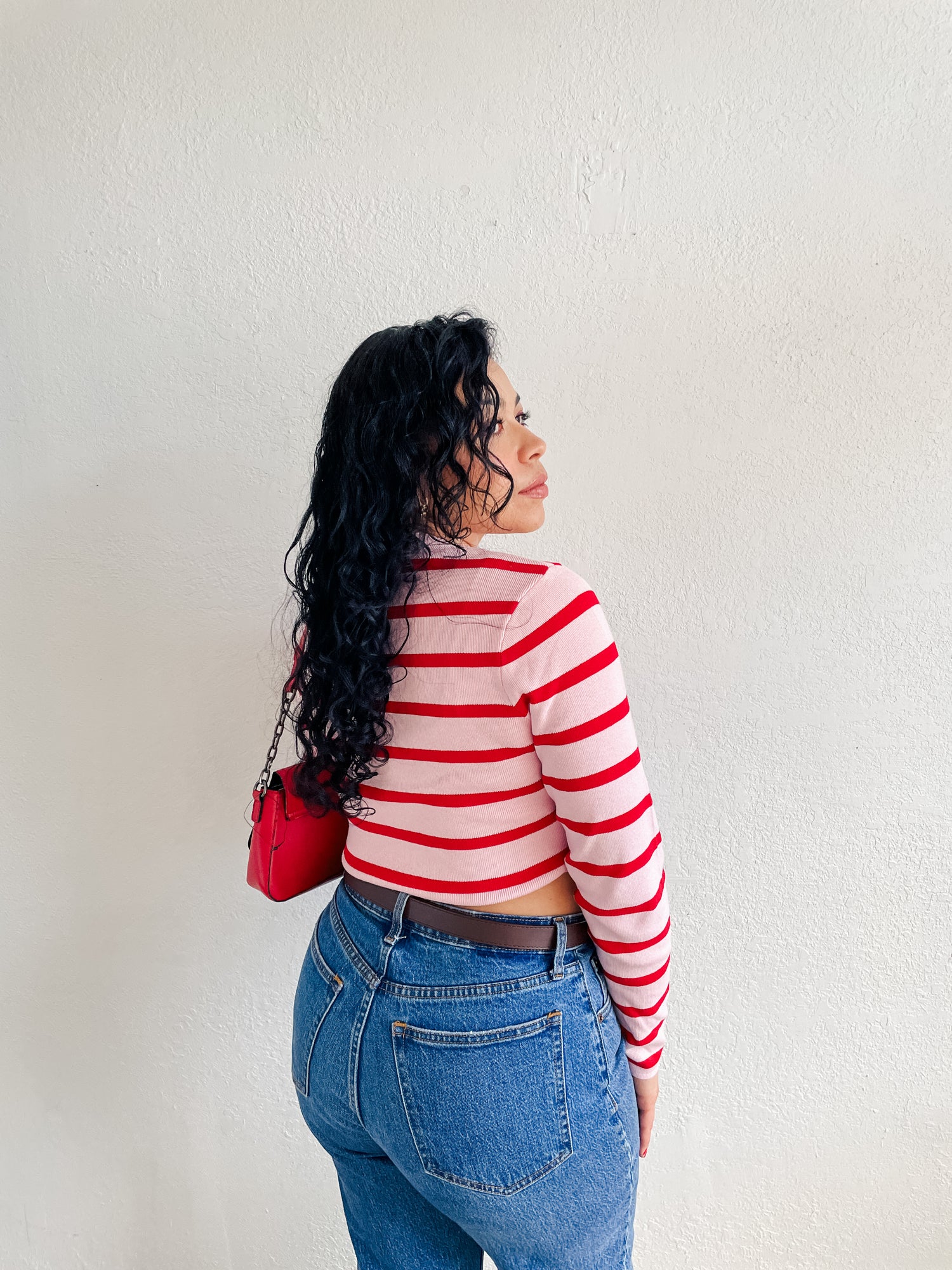 Top features stripe design, cropped length, curved hem, high neck and long sleeves.