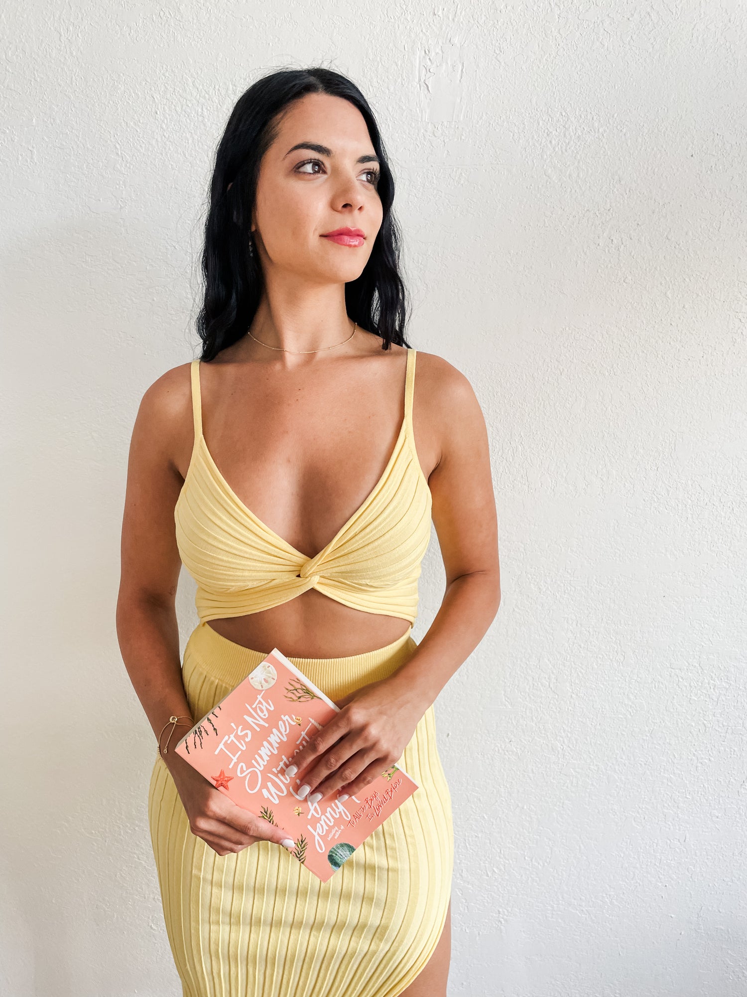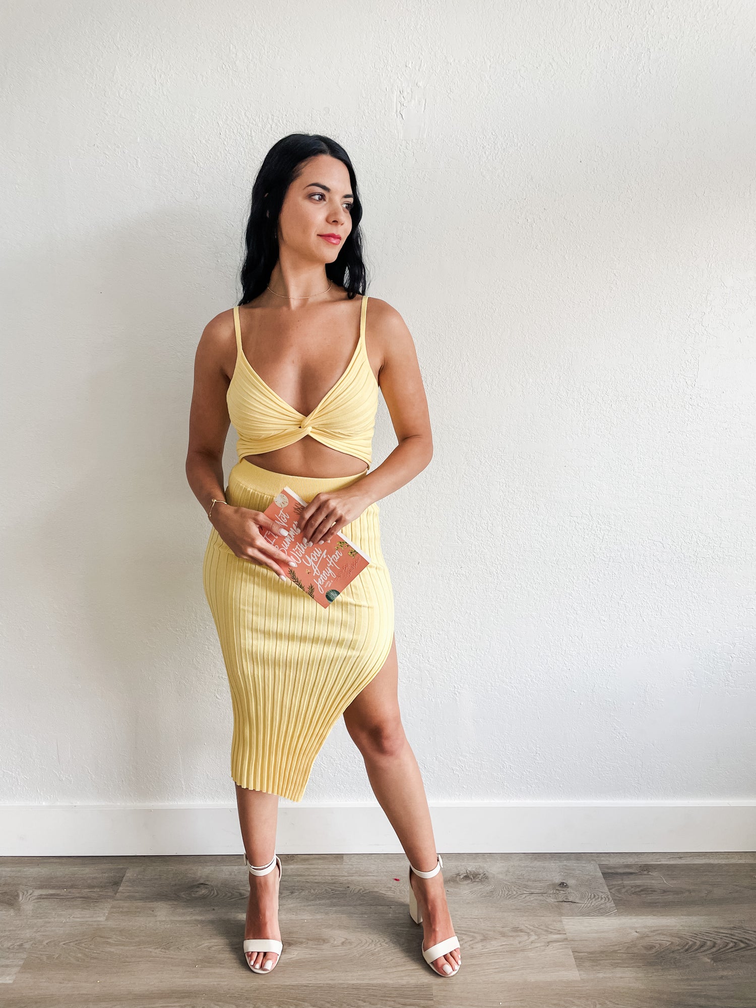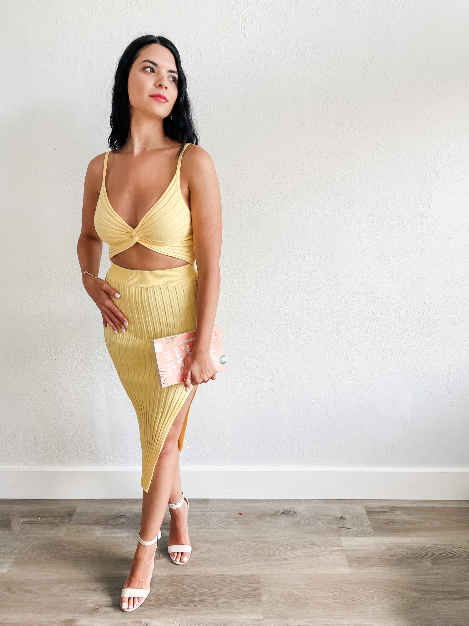 Set features spaghetti strap front twisted knit rib crop top with side slit midi skirt.