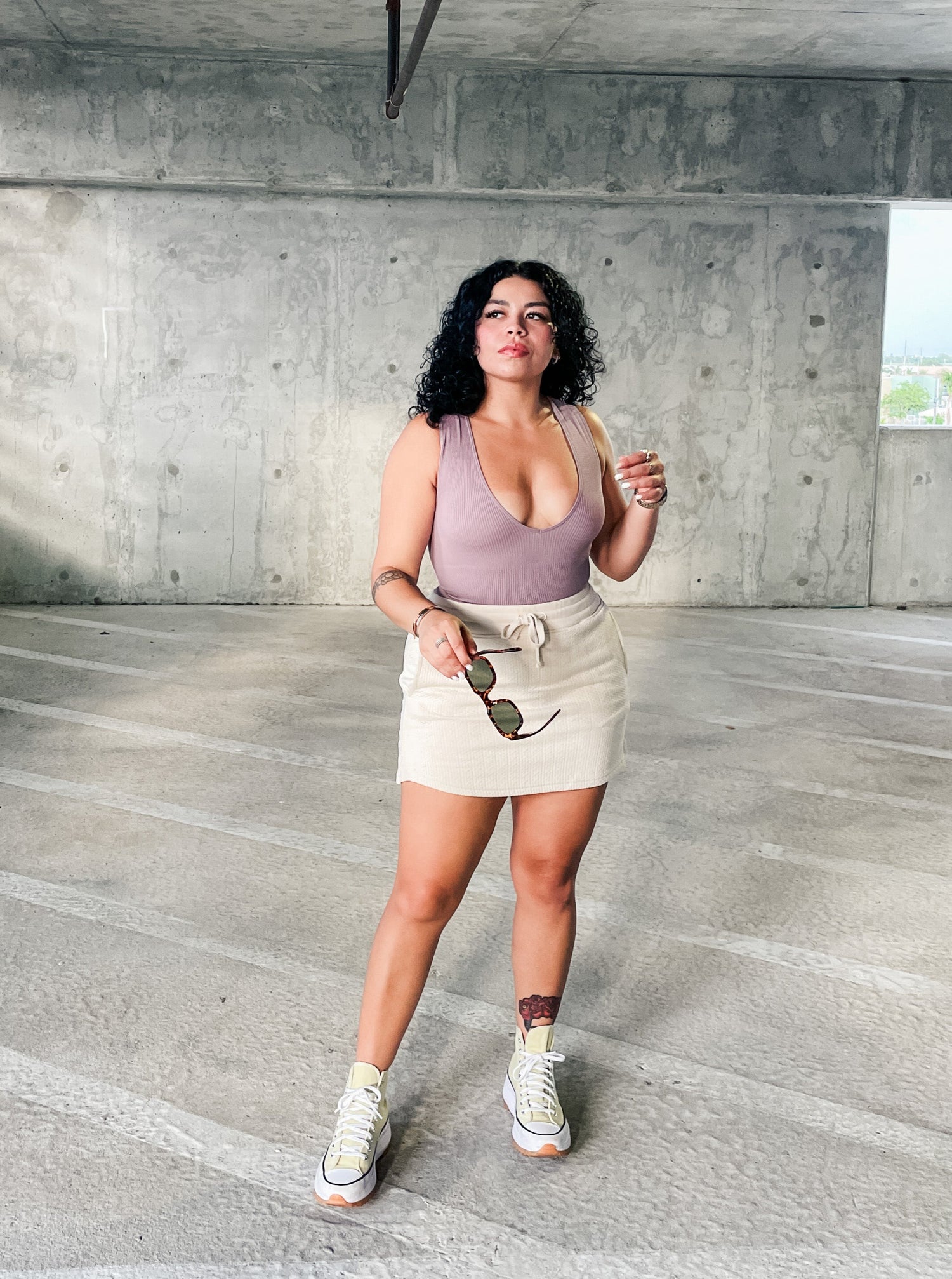 Skort features comfortable quilted material, hidden shorts, drawstring waist, and small stretchy ribbed insert on the sides.