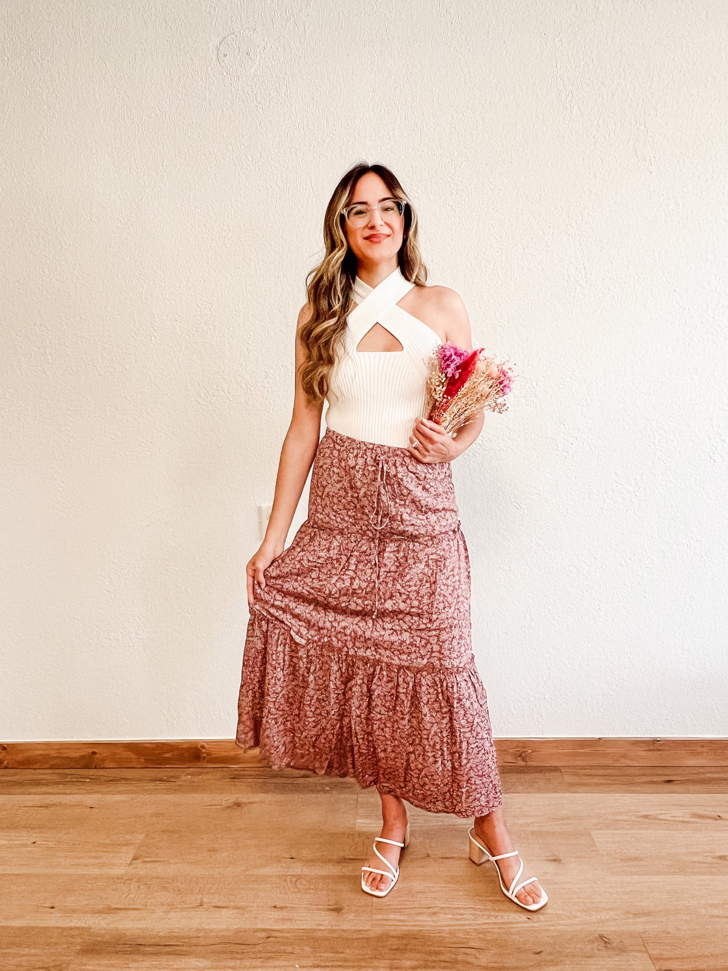 Top features a crisscross neckline with slightly pee-a-boo detailing on center front, crop length, and finished with clean weaved hem.