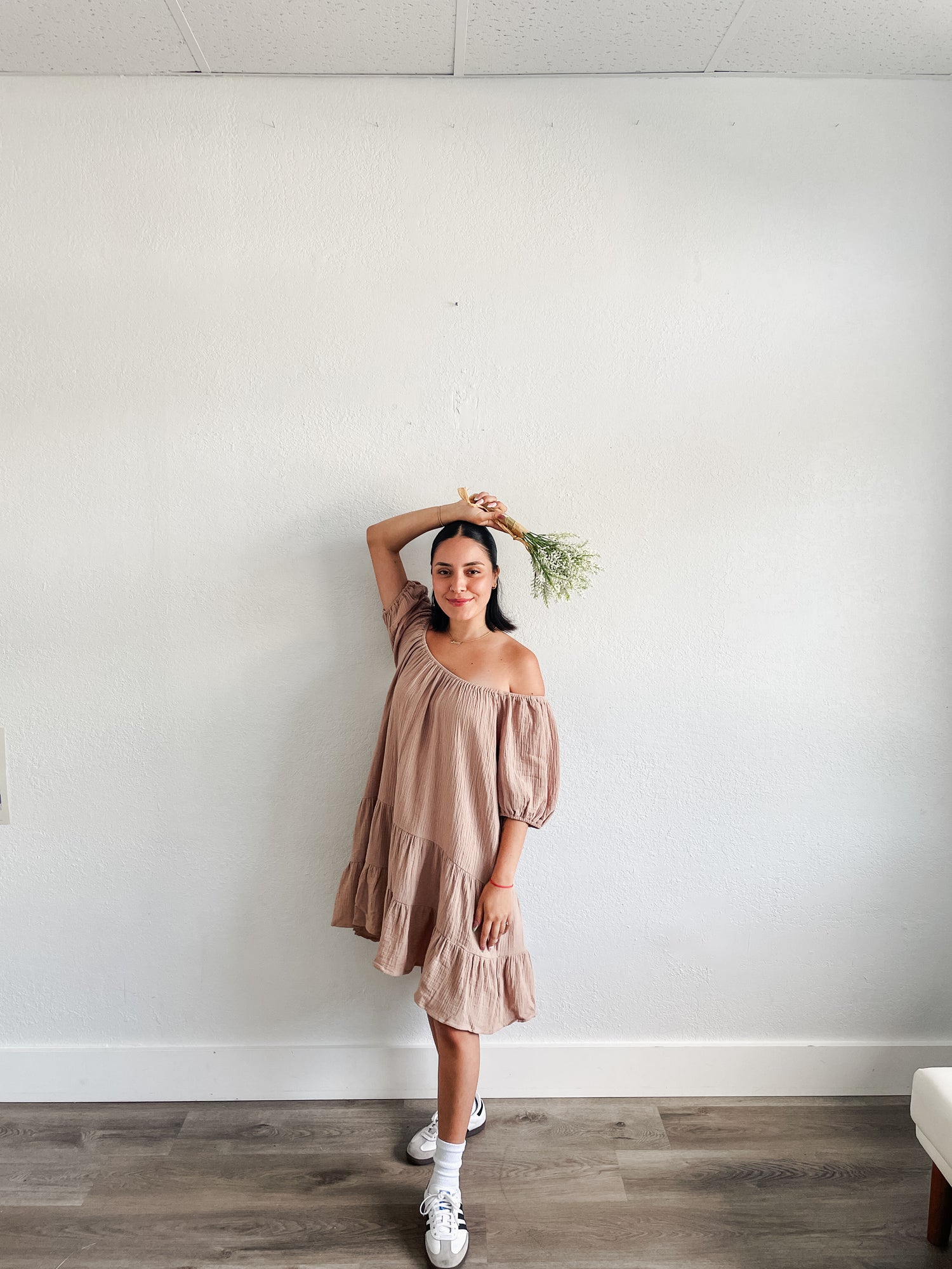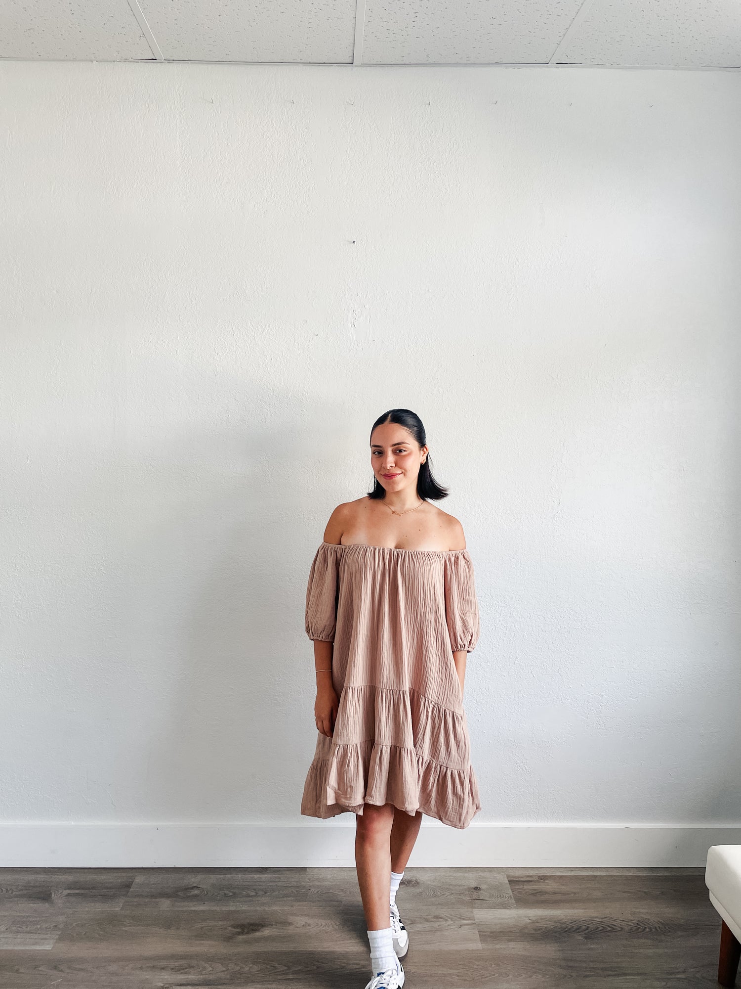 Dress features a cotton gauze material, elastic neck, arms and back, side pockets, tiered design and adjustable back bow.