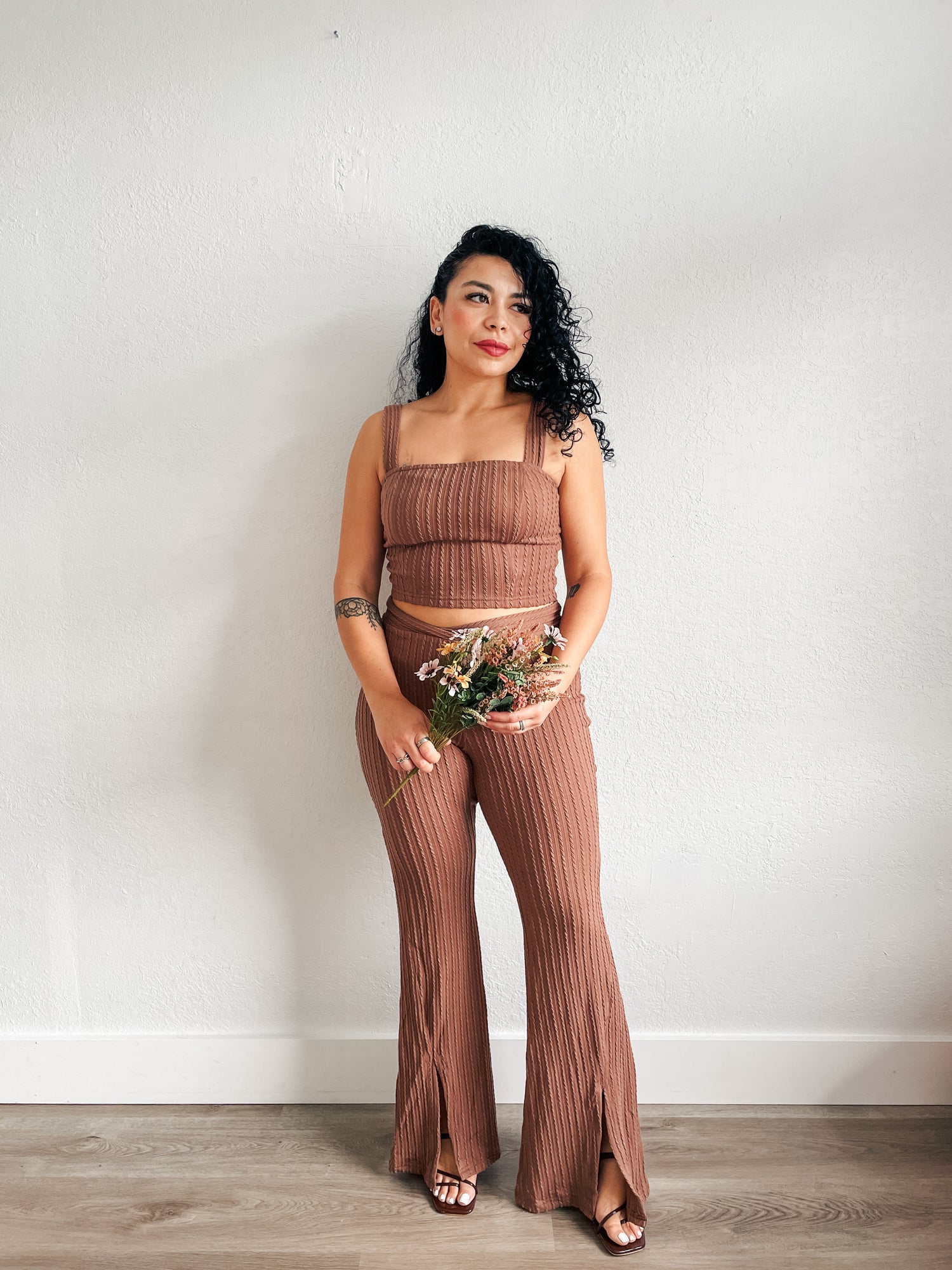 Set features cable knit fabric, sleeveless cropped top, matching pants with flare front slit.