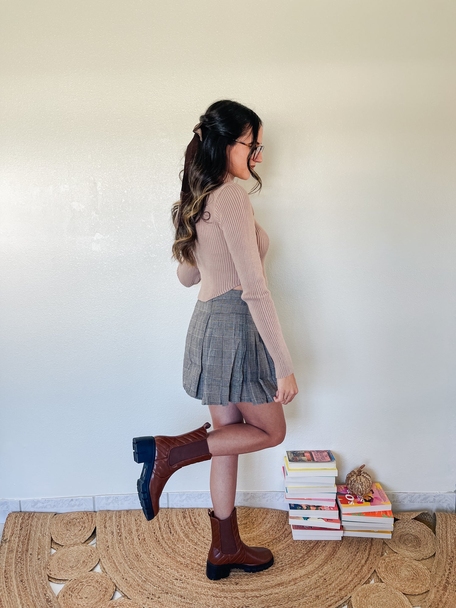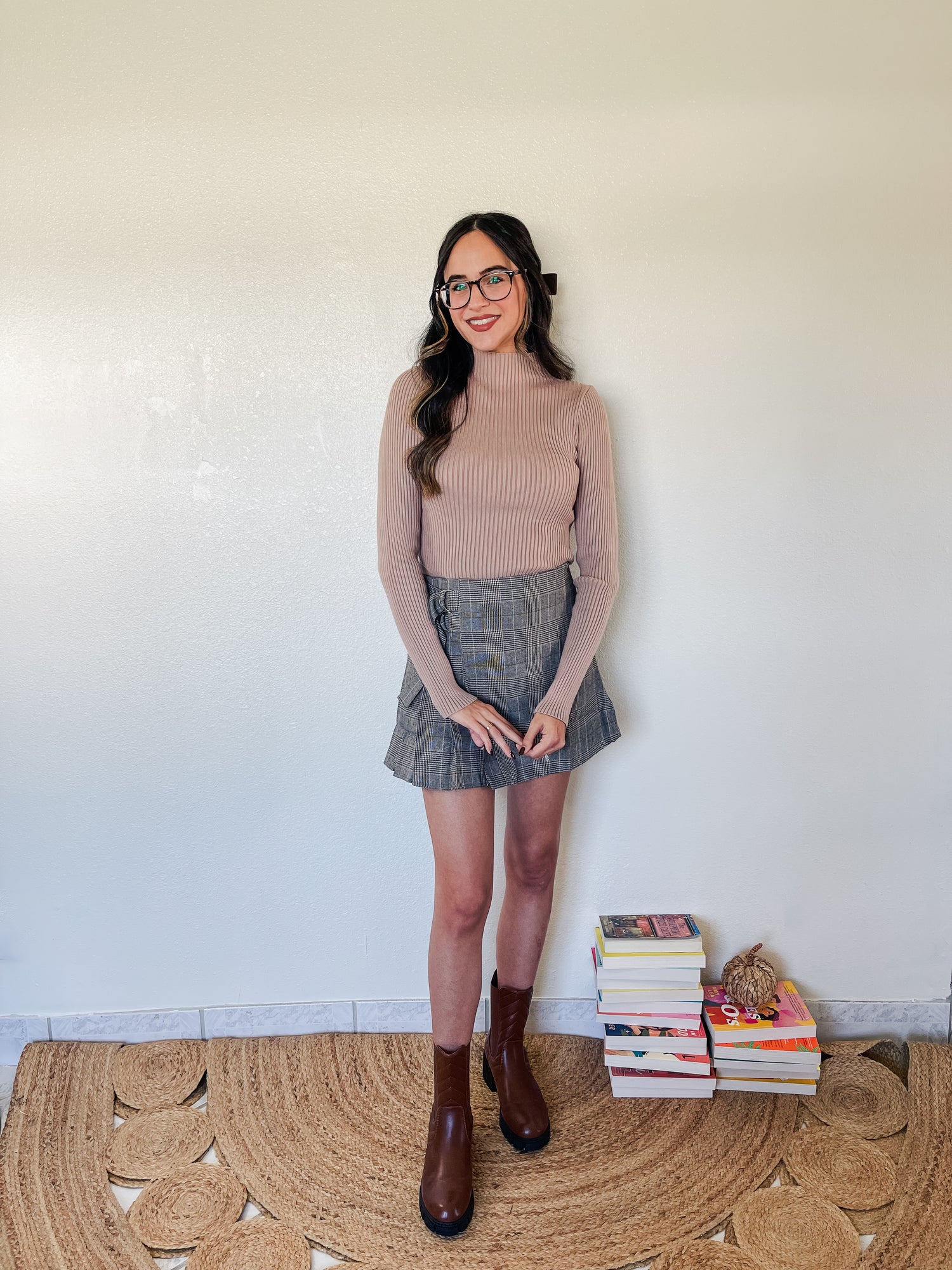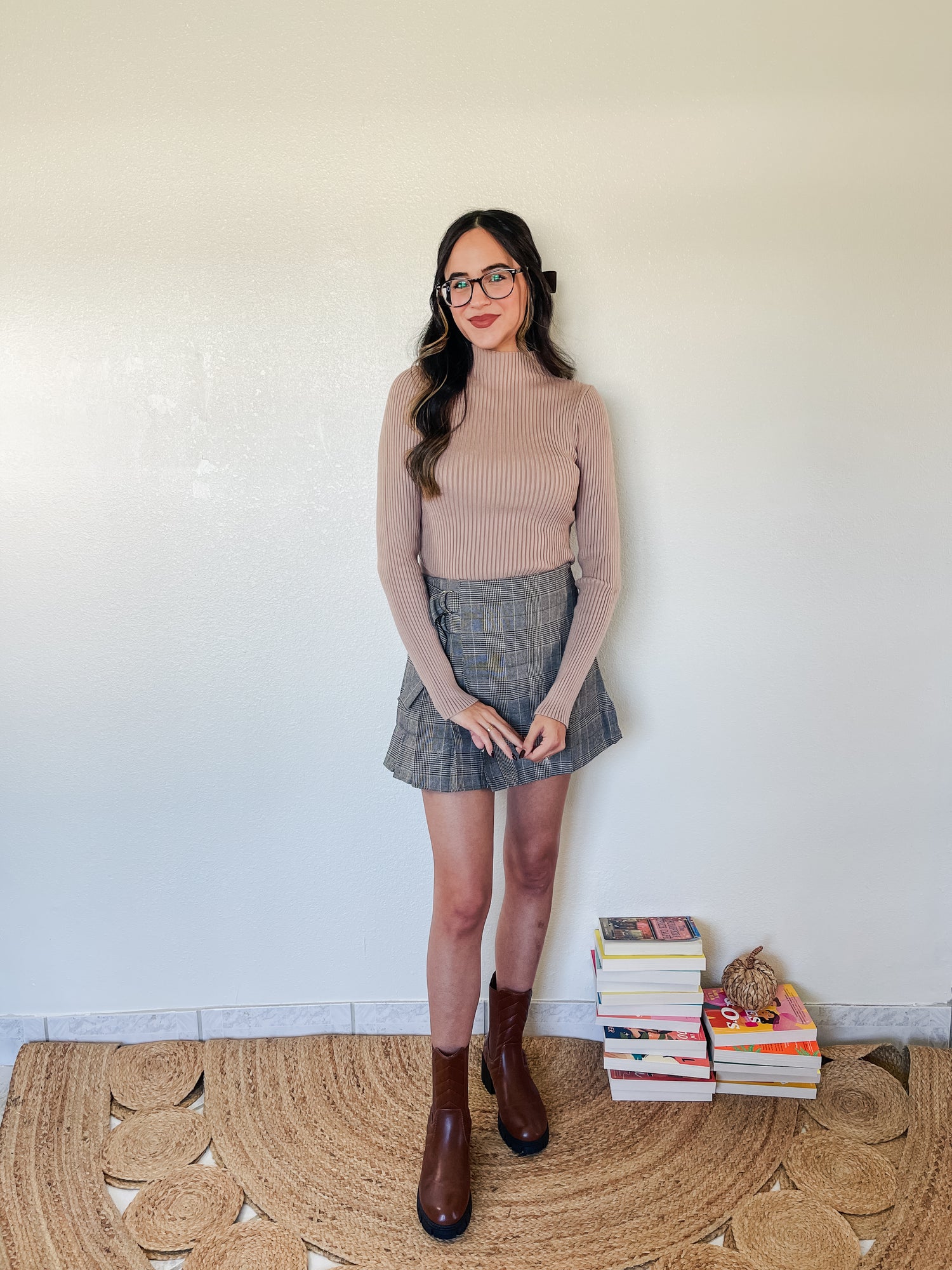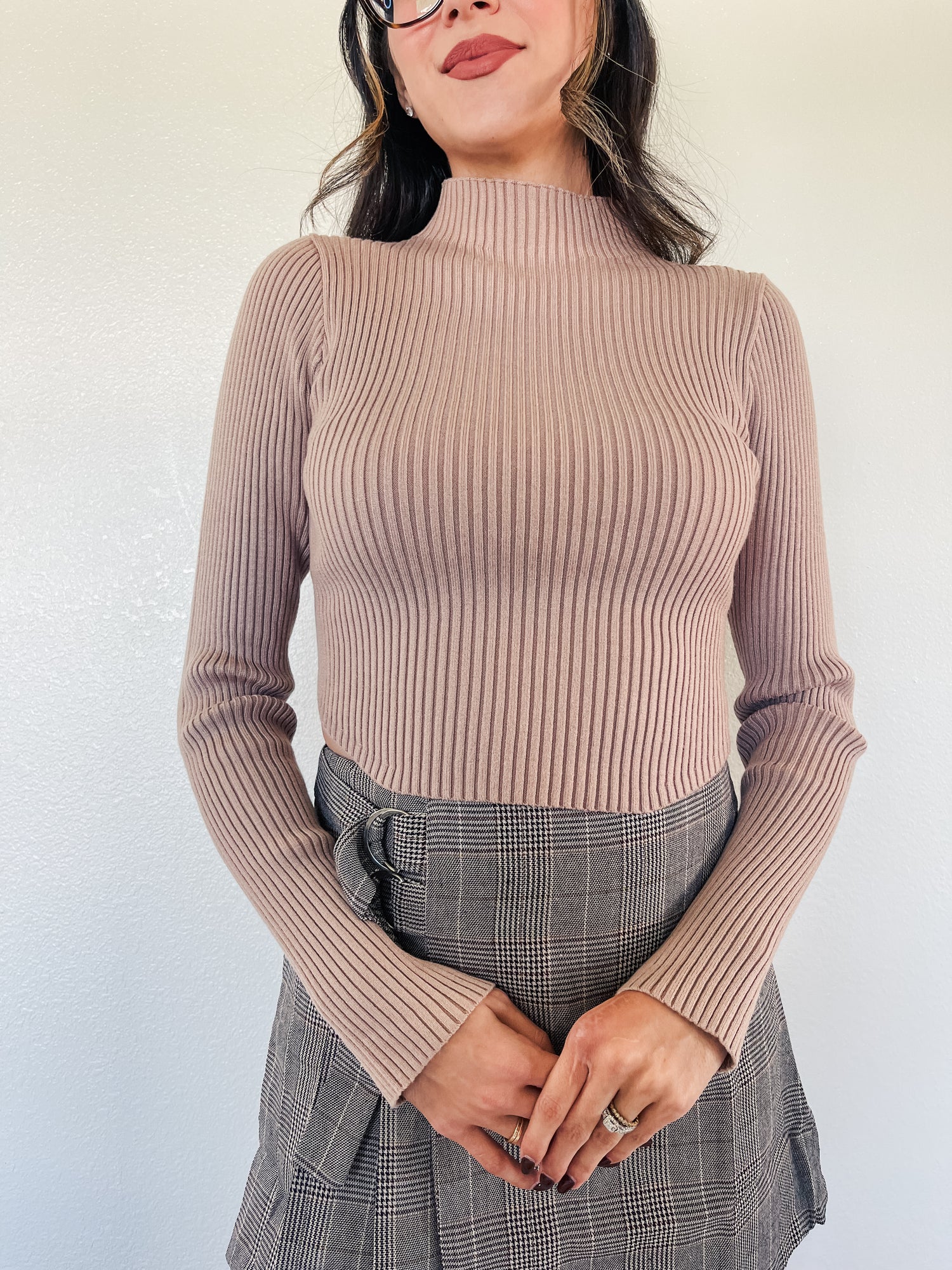 Top features long sleeve mock neck ribbed sweater crop top.