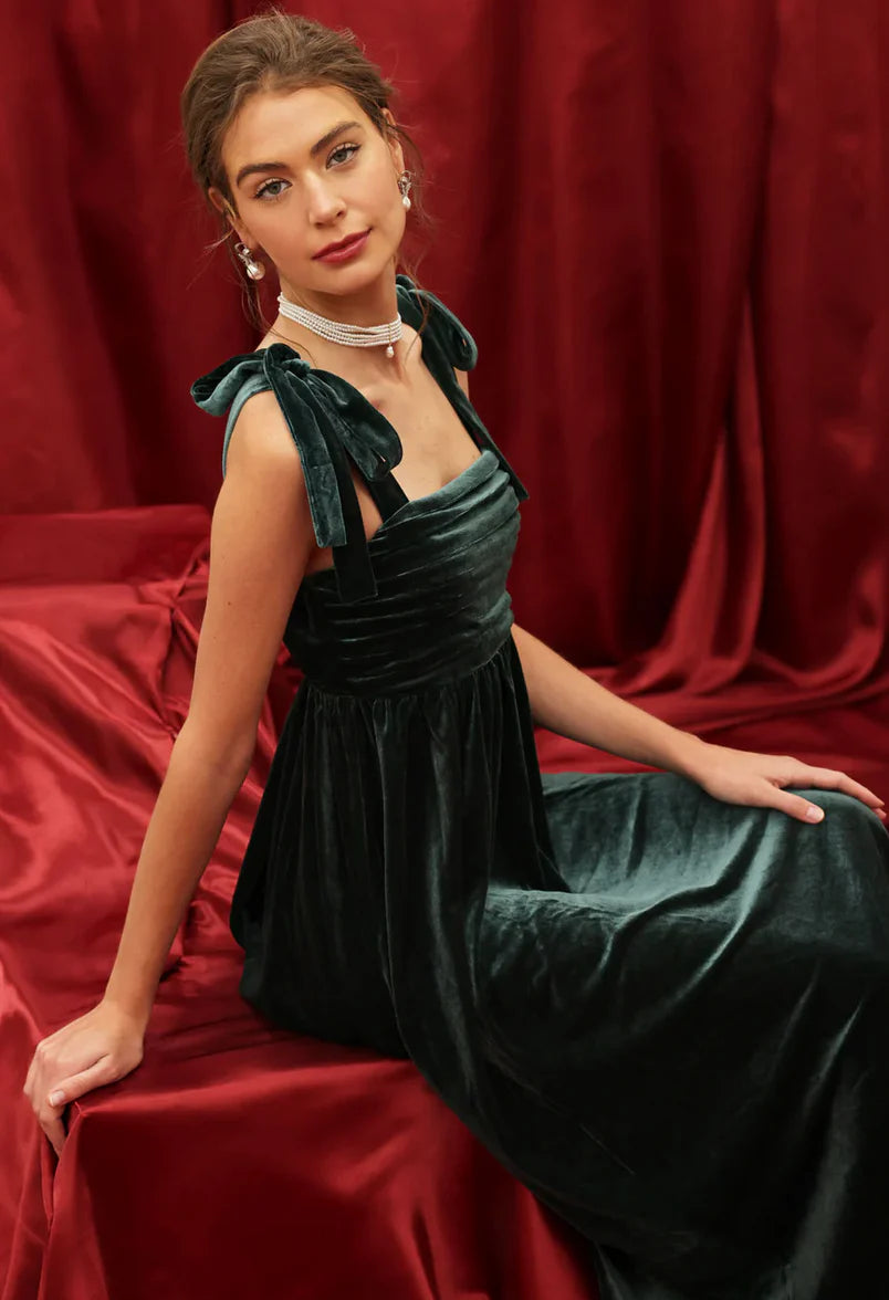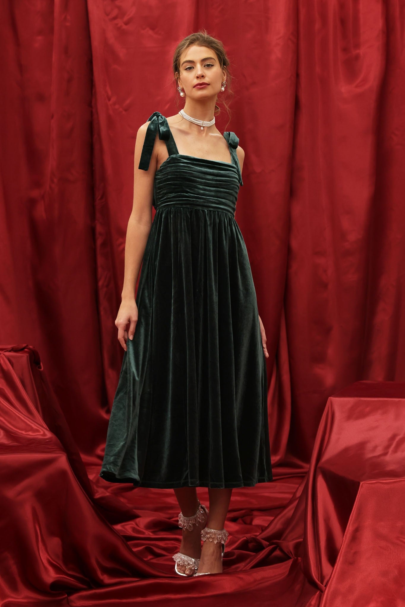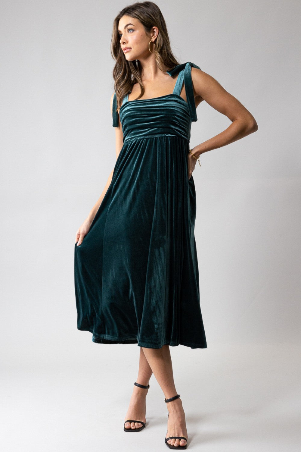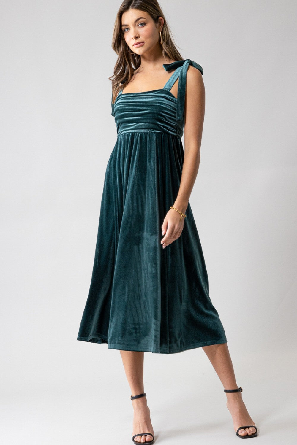 Dress features square neckline, shoulder tie straps, pleated detail, velvet material, midi length, back smocking. Lined.