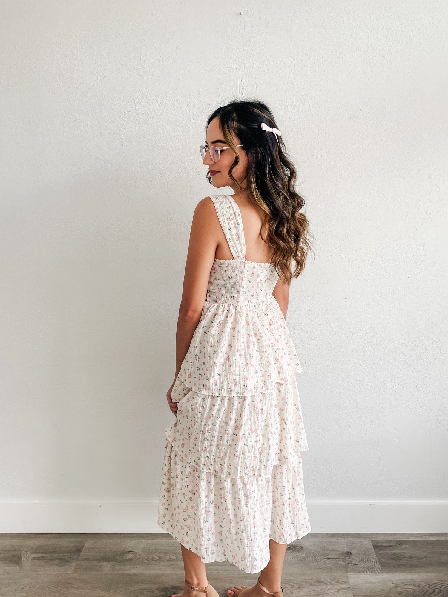 Dress features floral print, ruffled layers, lace hem detail, wire bone, and hidden zipper.