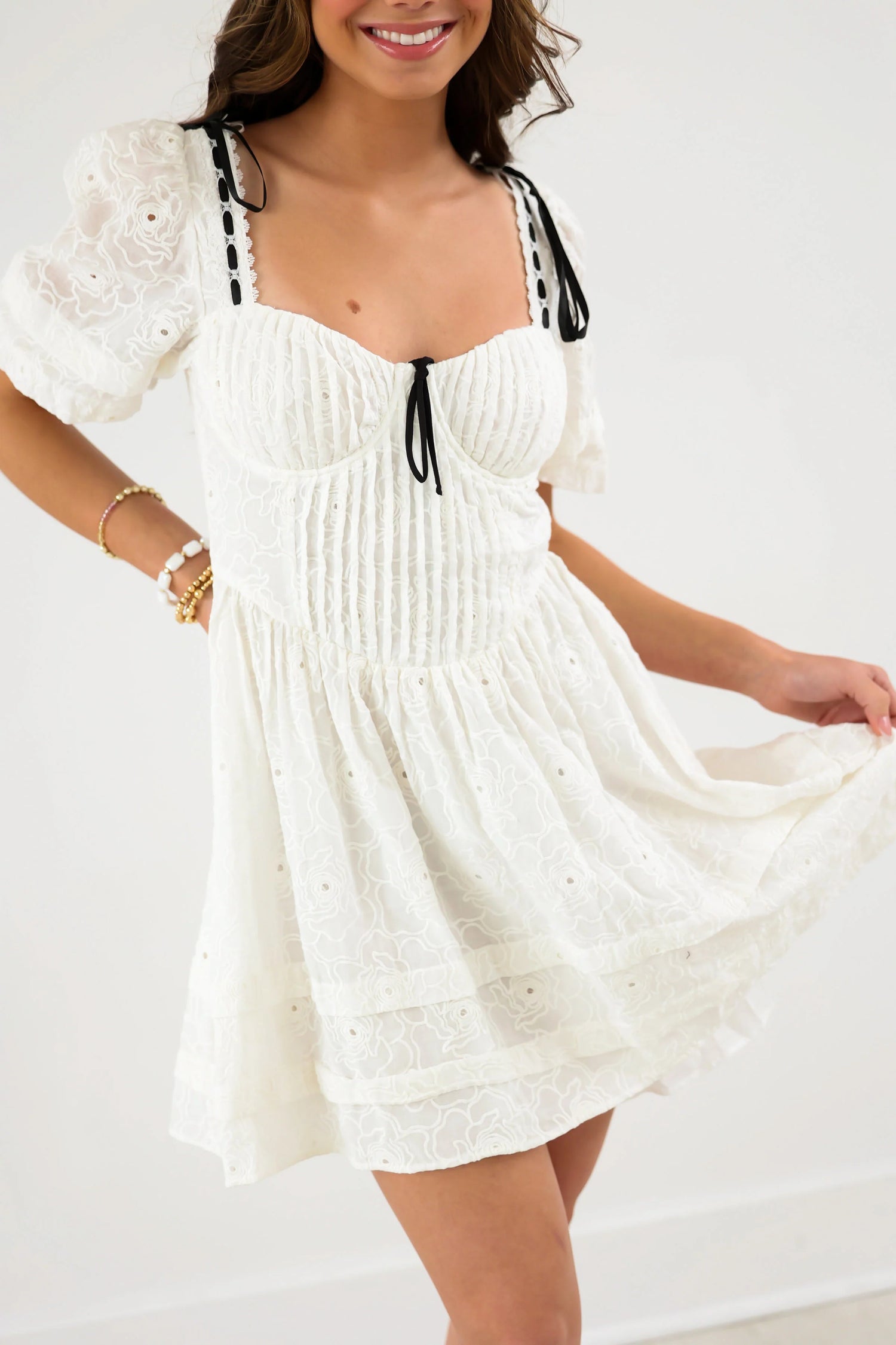 Dress features textured abstract rose pattern with eyelet detail, black ties at the shoulder and chest, corset style bodice with cups and boning, puff sleeves and mini dress length. Lined.