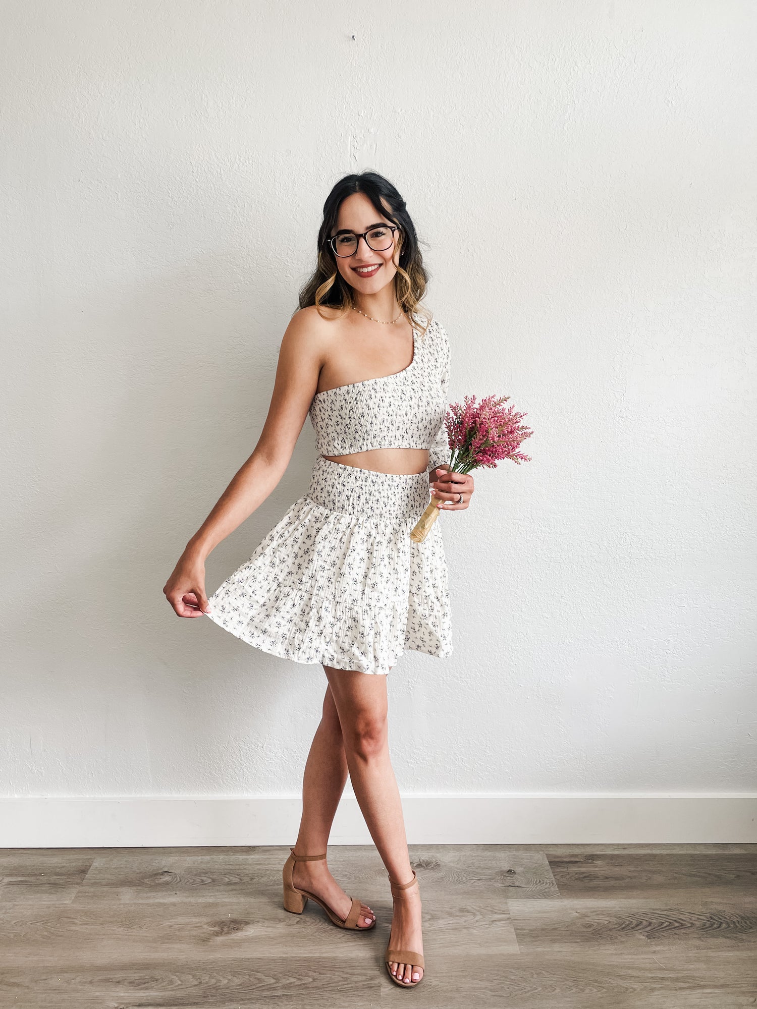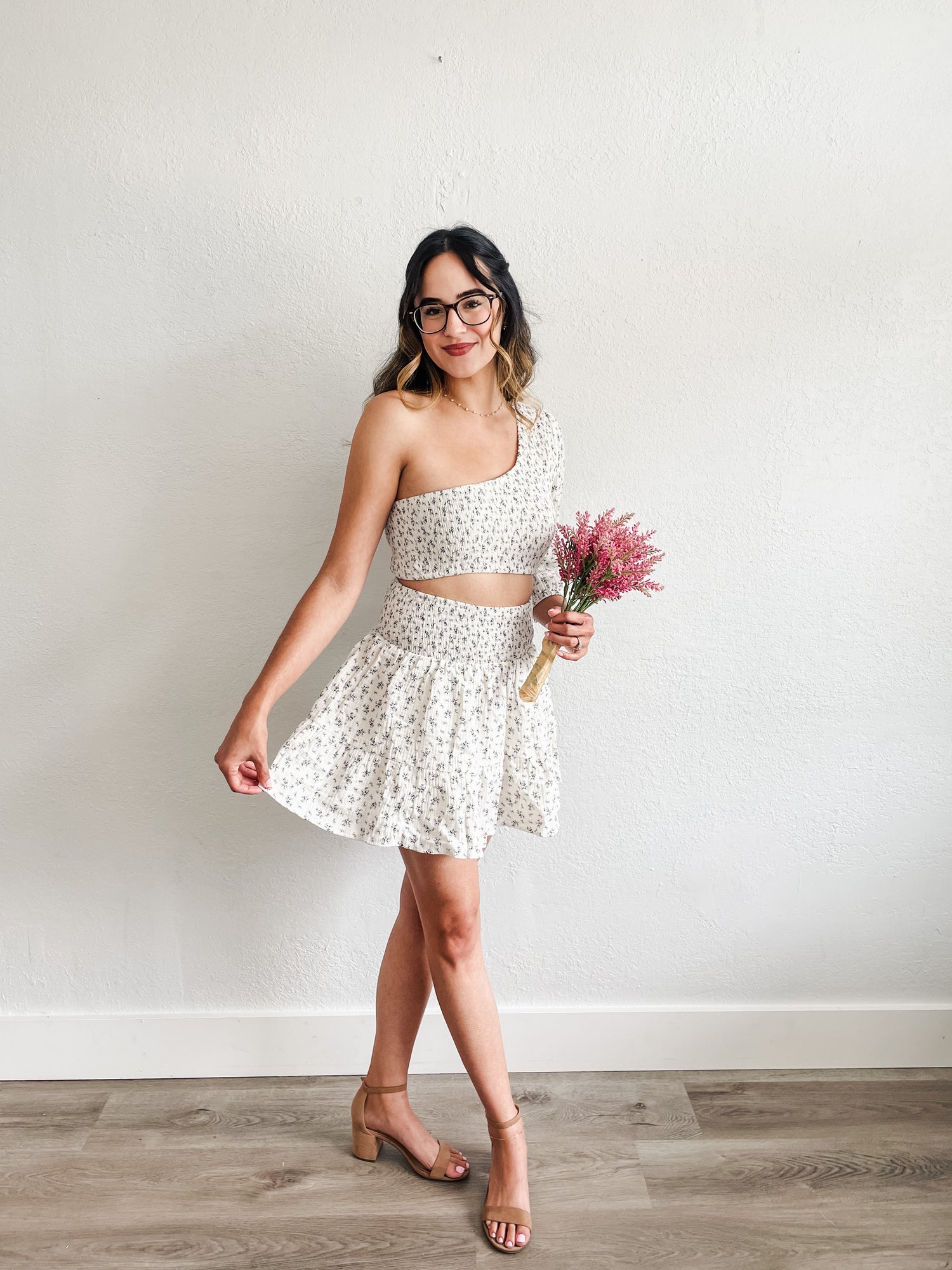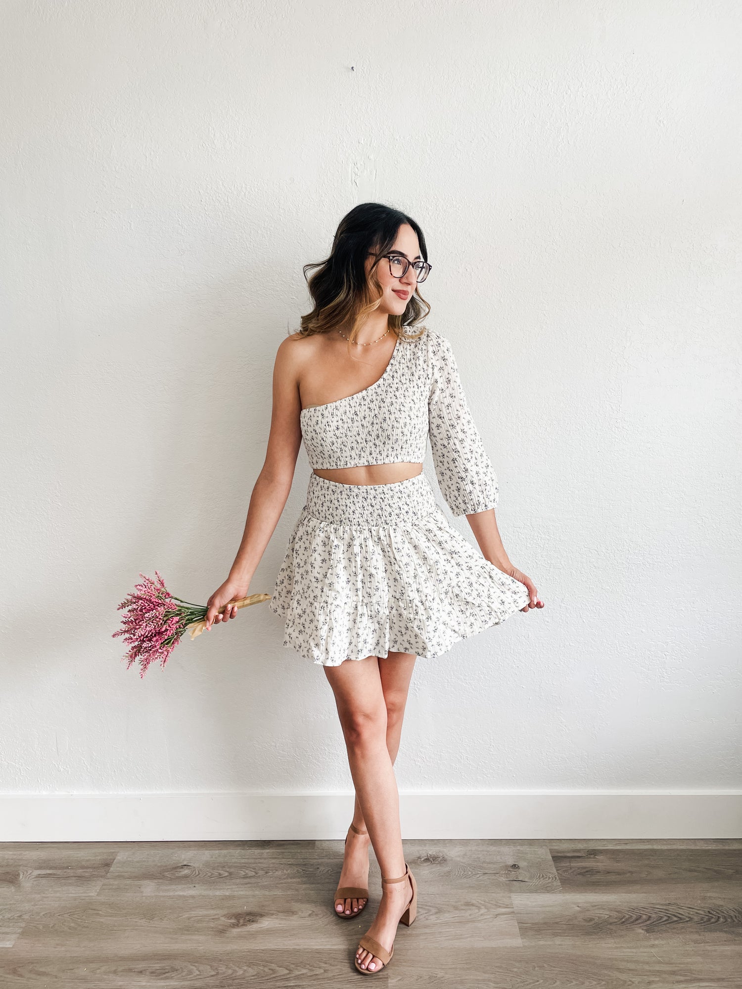 Set features Ivory one shoulder cropped top and matching floral mini skirt with elastic waist.