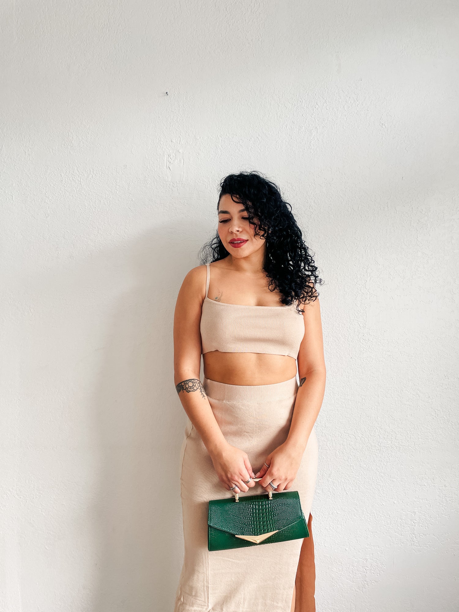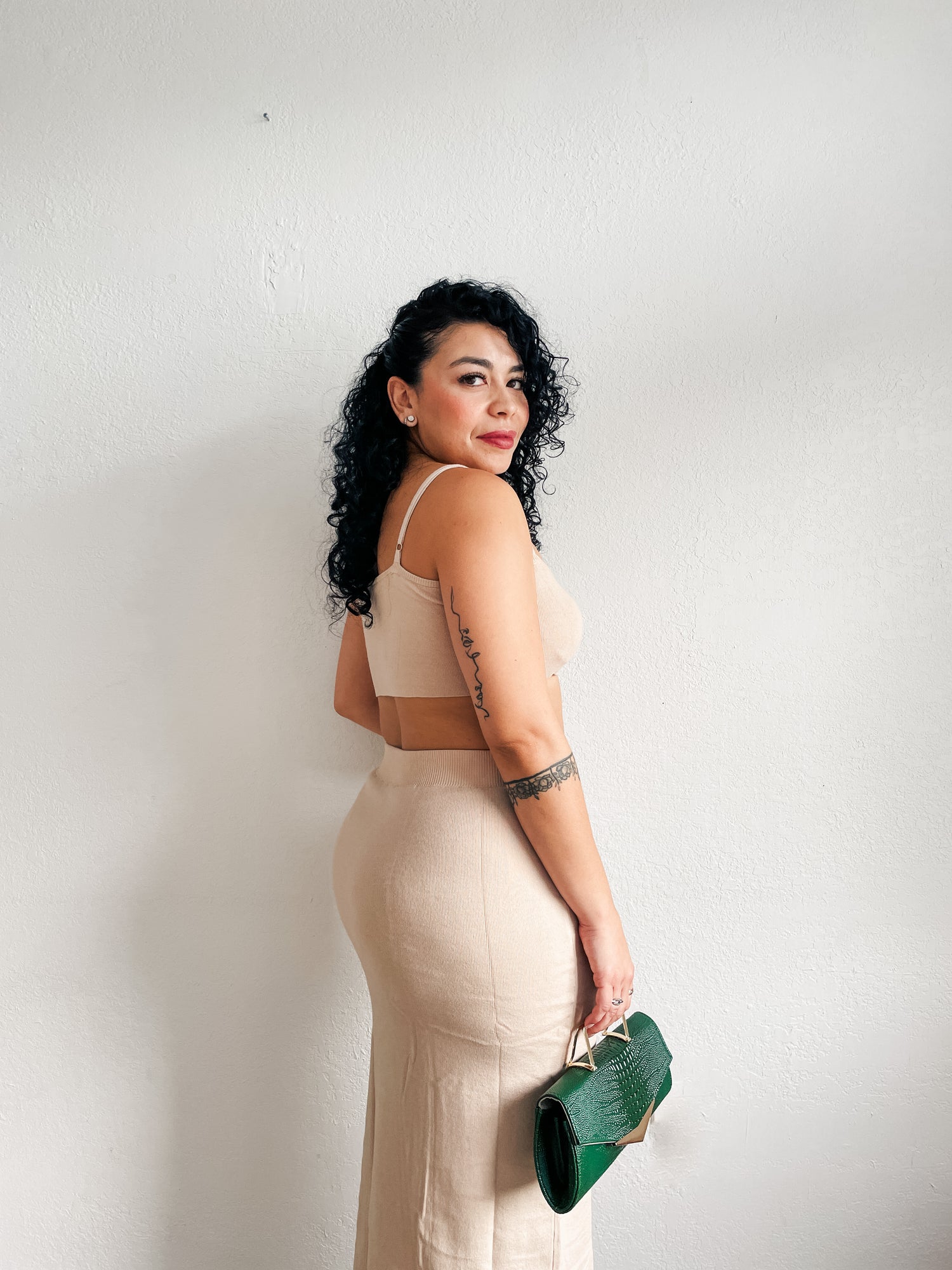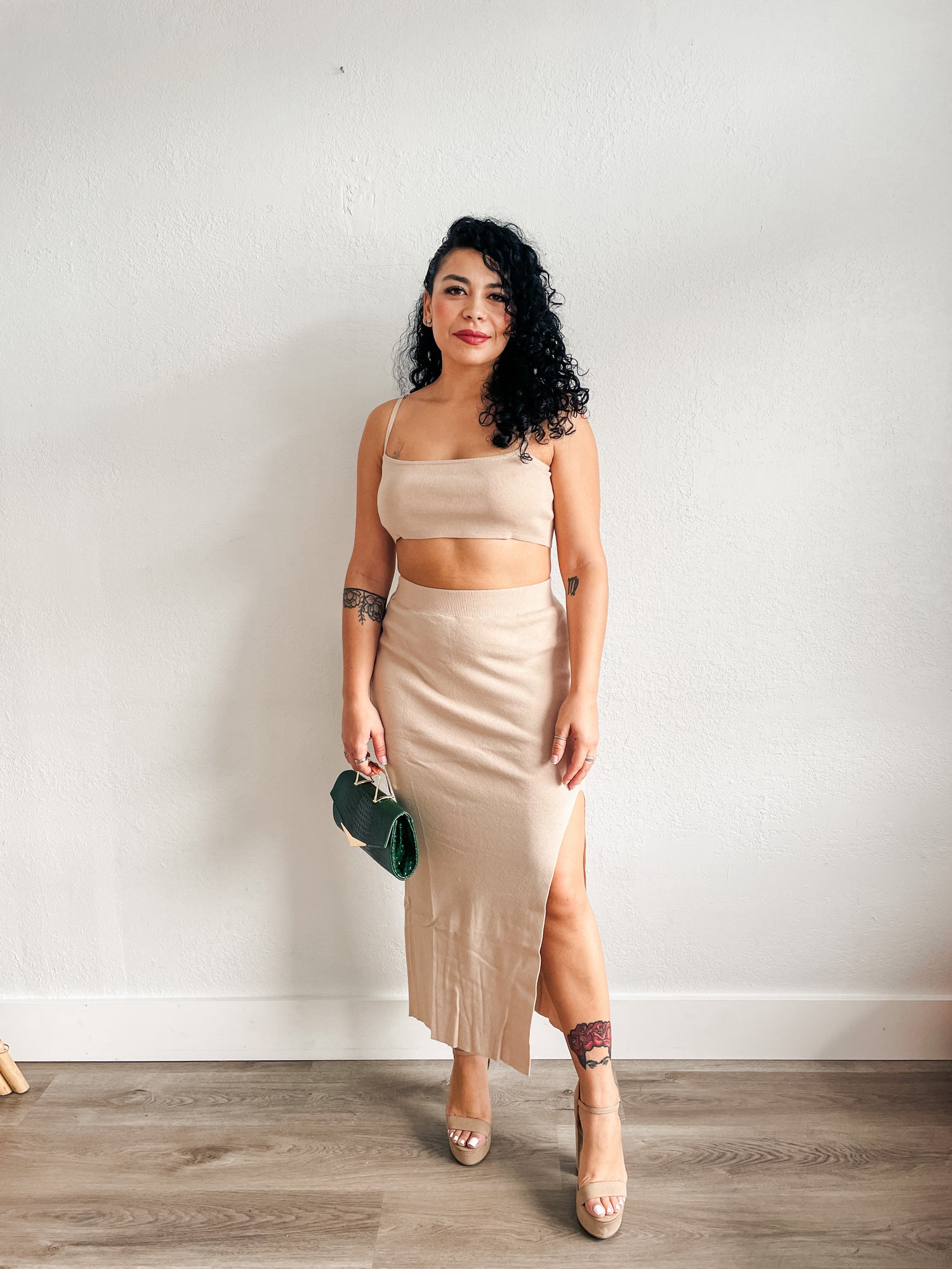 Set features medium-weight knit material, a crop top with adjustable straps, square neckline and a matching midi skirt with front slit.