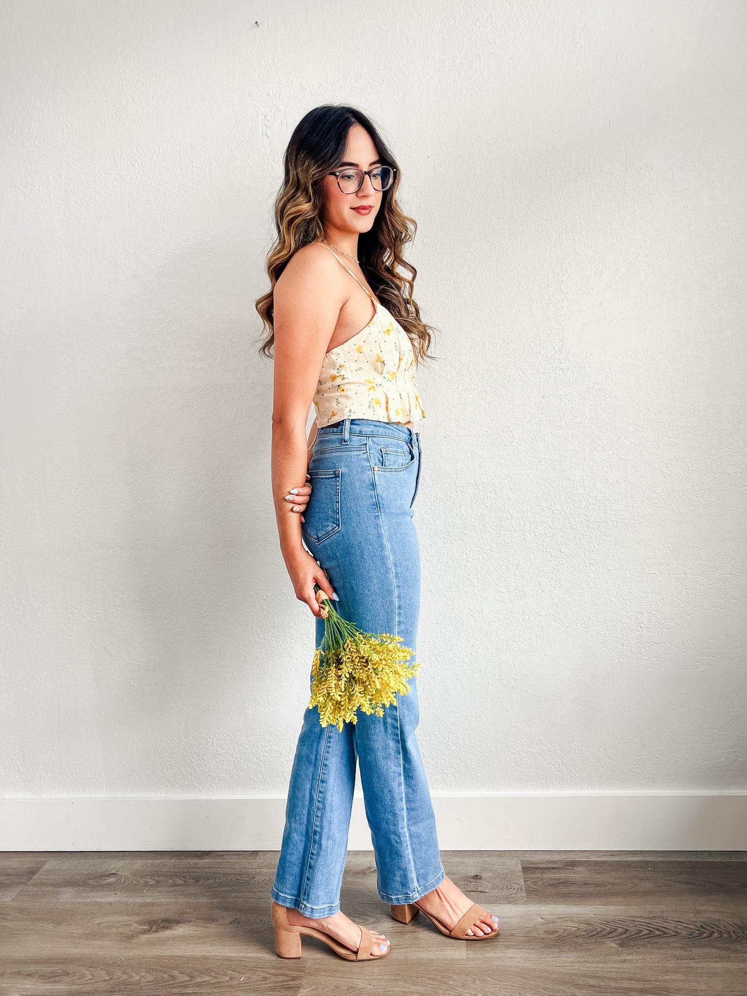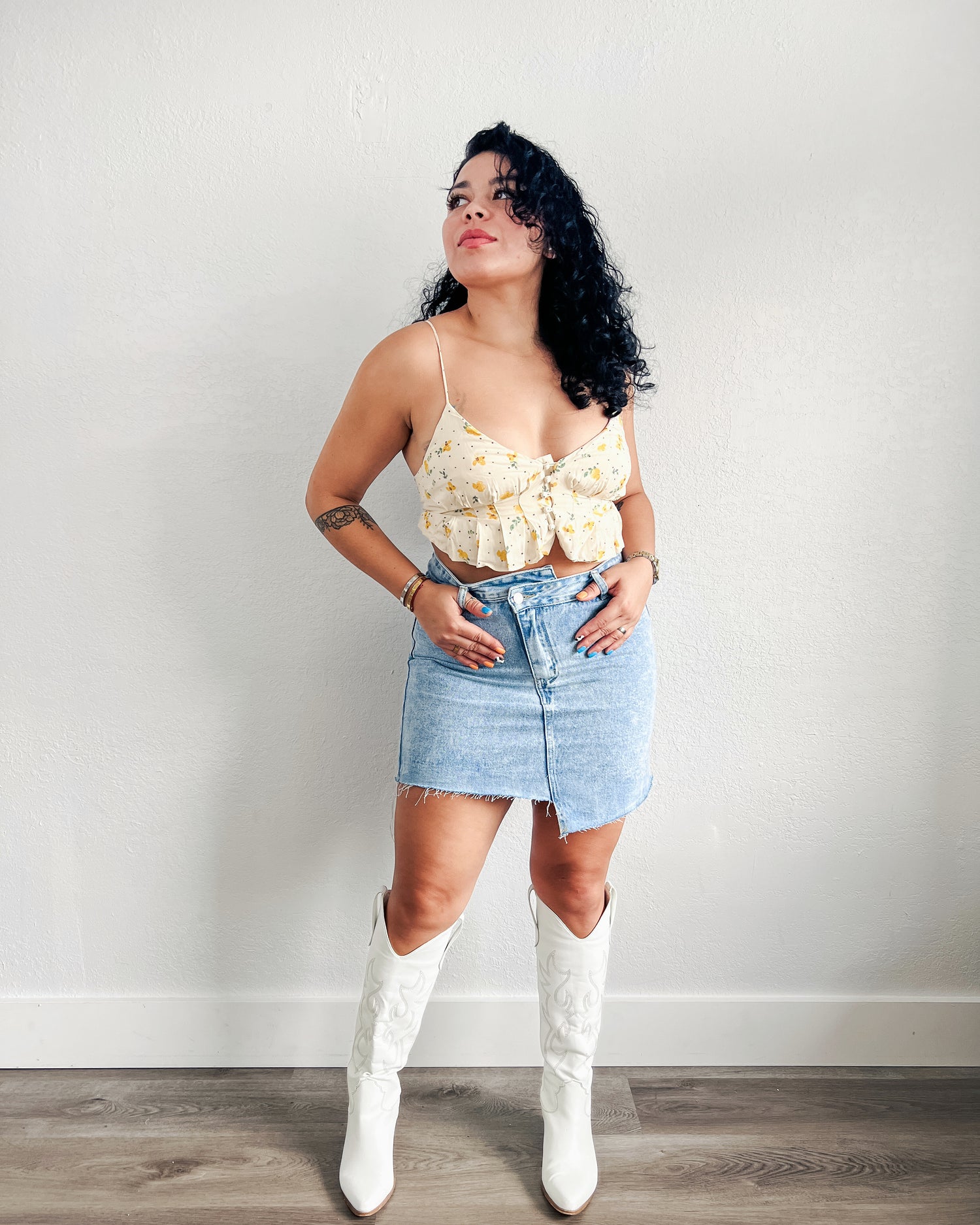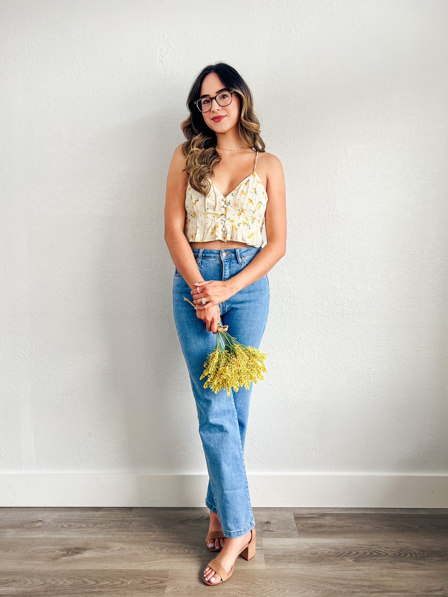 Top features floral print, lace-up closure on back, spaghetti straps, plunging neckline, self button on front and flared hem.